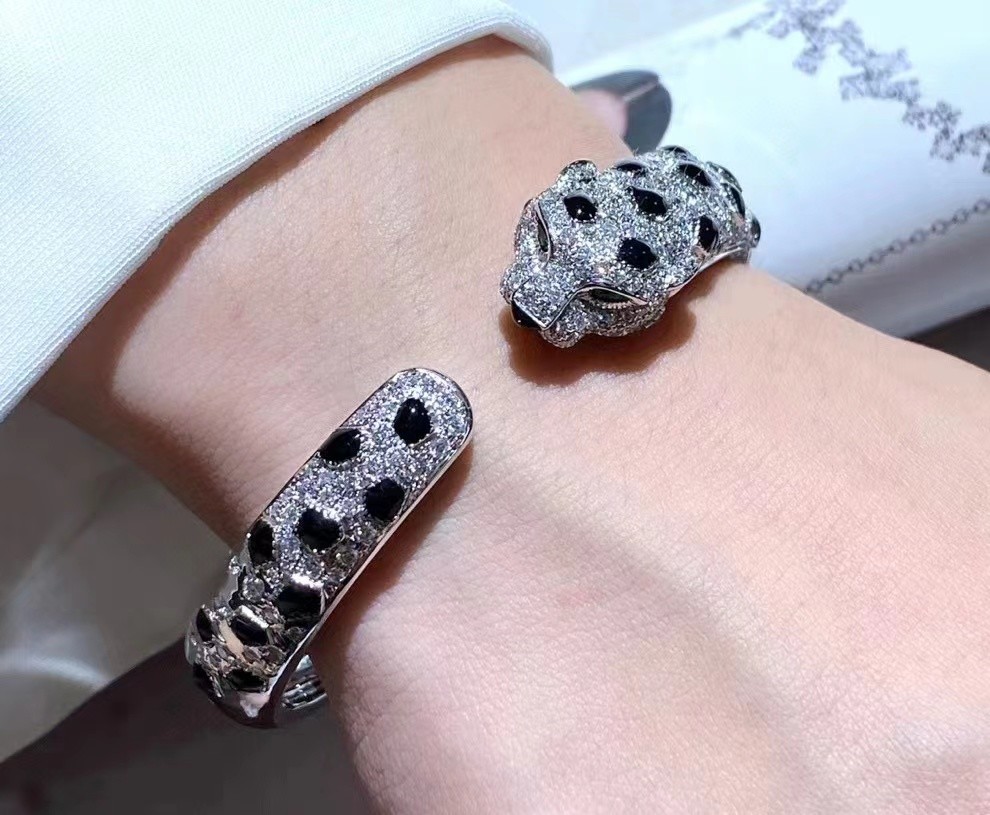 판테르 드 카르티에 팔찌, 18K 백금, 오닉스, 에메랄드, 화려한 다이아몬드